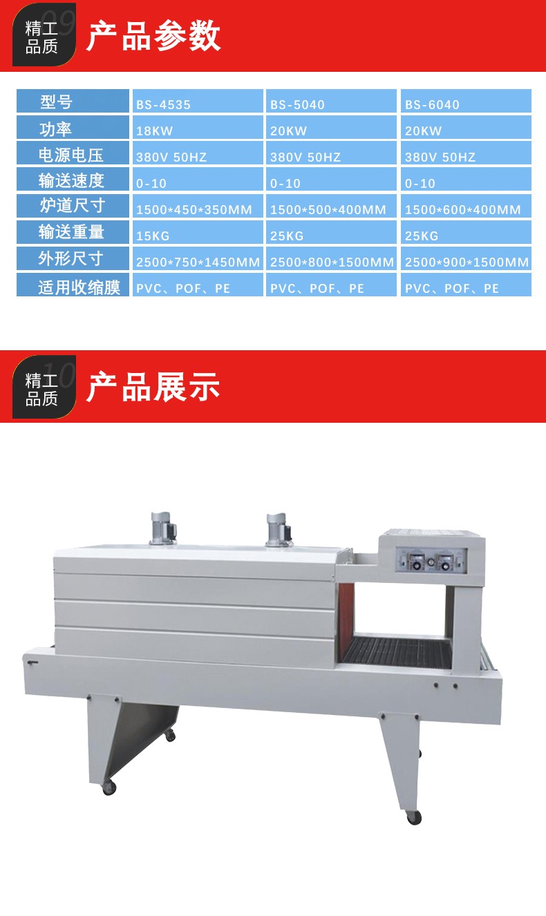 - 高效的加熱與收縮系統(tǒng):其加熱系統(tǒng)采用高效的加熱元件,能夠快速將空氣加熱到所需溫度,從而加快薄膜的收縮速度。同時,噴氣系統(tǒng)通過合理設(shè)計的噴氣嘴和強大的風機,將熱空氣均勻地噴射到薄膜上,使薄膜能夠在短時間內(nèi)實現(xiàn)全方位的收縮。與傳統(tǒng)的包裝方式相比,這種高效的加熱和收縮系統(tǒng)可以顯著提高包裝速度,滿足大批量生產(chǎn)的需求。