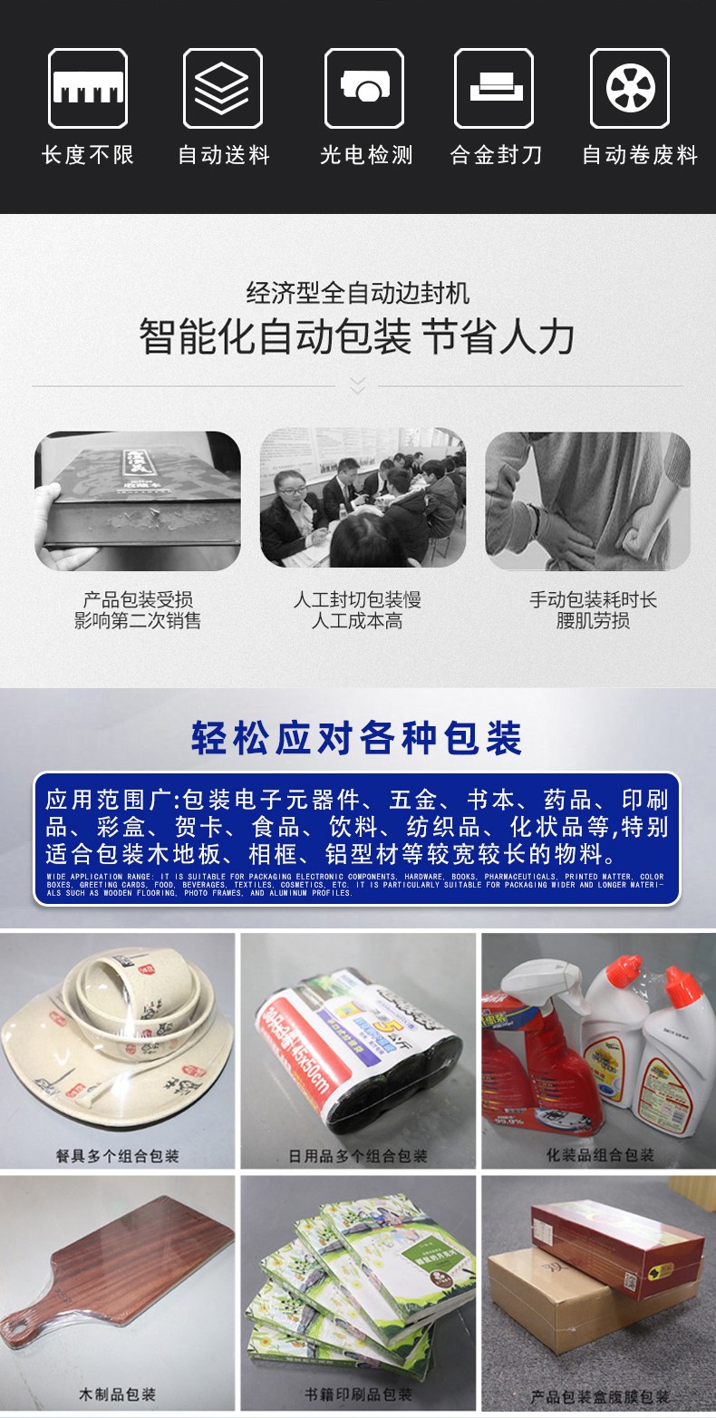 全自動邊封熱收縮包裝機的 “自動化程度高” 與 “適用范圍廣”,是其在各行業(yè)廣泛應(yīng)用的核心優(yōu)勢,兩者相互支撐、協(xié)同提升設(shè)備的實用價值,具體可從以下維度深入解析: