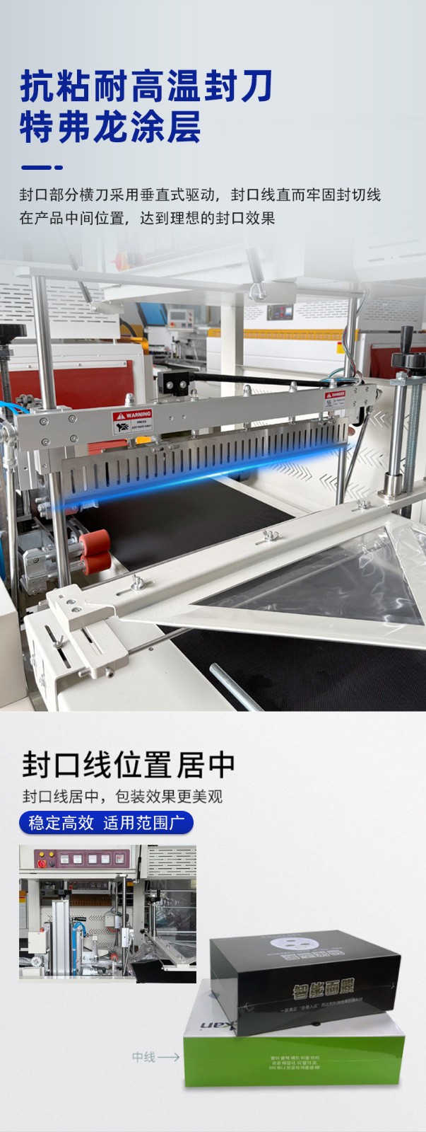 - 兼容多種包裝薄膜:其恒溫加熱封切系統(tǒng)可適配 PE、PVC、POF 等多種常用熱收縮膜。而且封刀多采用美國杜邦特弗龍防粘涂層,能應對不同薄膜的封切溫度需求,避免薄膜粘連刀具,保證封口牢固不焦化,像 POF 這種對封切精度要求高的環(huán)保薄膜,也能實現(xiàn)理想封切效果。