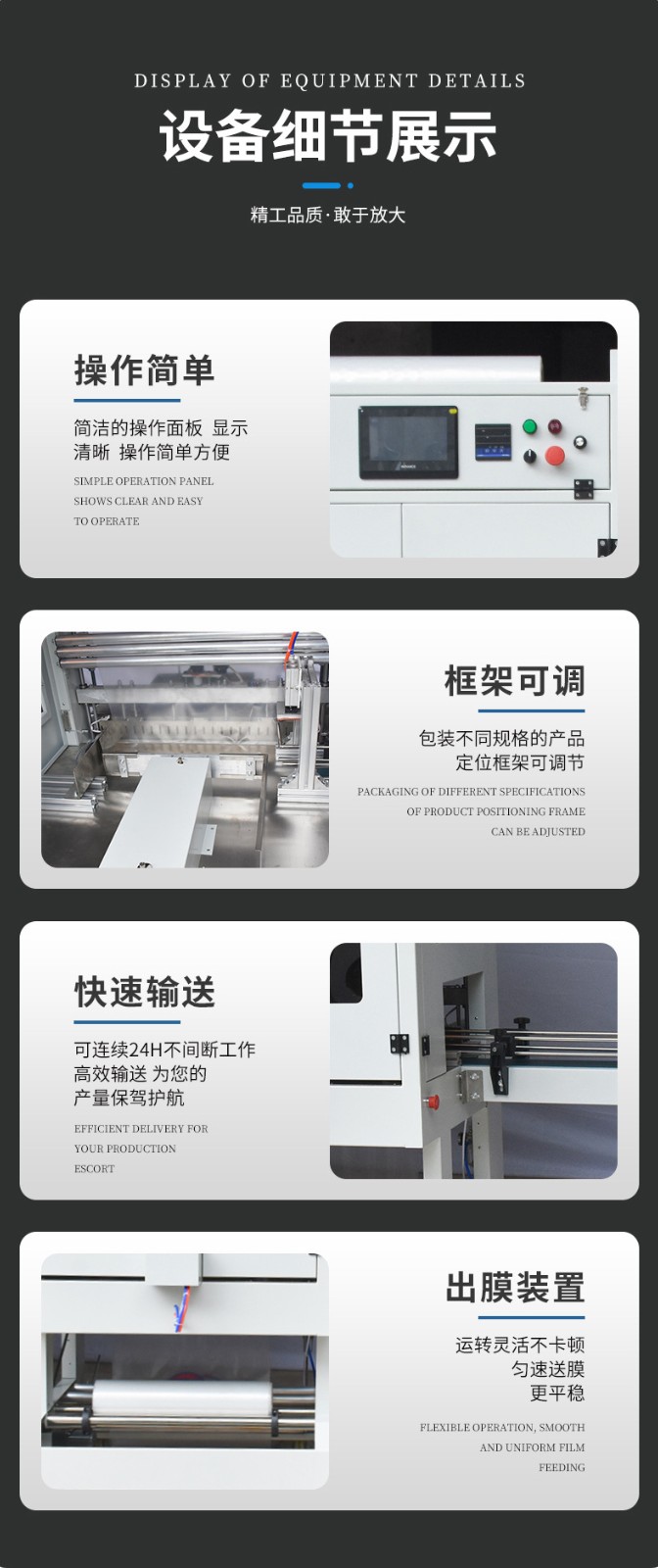 - 套膜精度高:通過精密的機械結(jié)構(gòu)和先進的控制系統(tǒng),能夠精確地將薄膜套在產(chǎn)品上。薄膜的包裹位置、松緊度等都能得到精準控制,確保每個產(chǎn)品的套膜質(zhì)量一致,包裝外觀整齊、美觀。這種精準性對于提升產(chǎn)品形象和品牌價值非常有幫助。