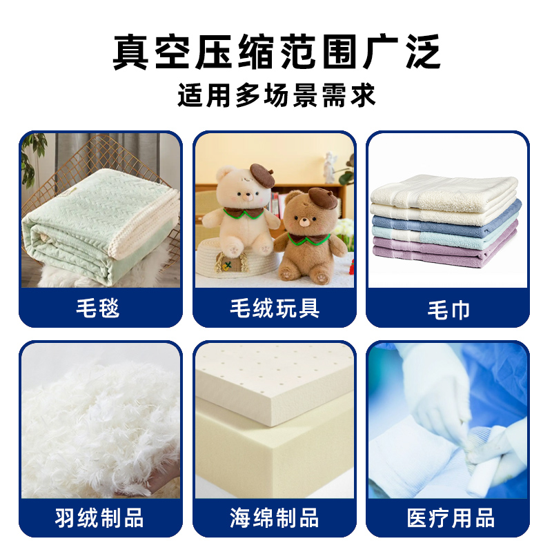 - 家居用品:用于羽絨被、棉被、枕頭、毛絨玩具等蓬松物品的收納包裝,可大大節(jié)省存儲空間,使家居環(huán)境更加整潔有序。