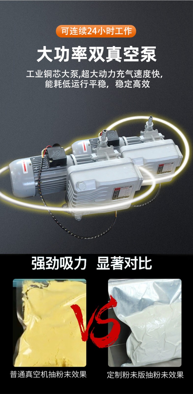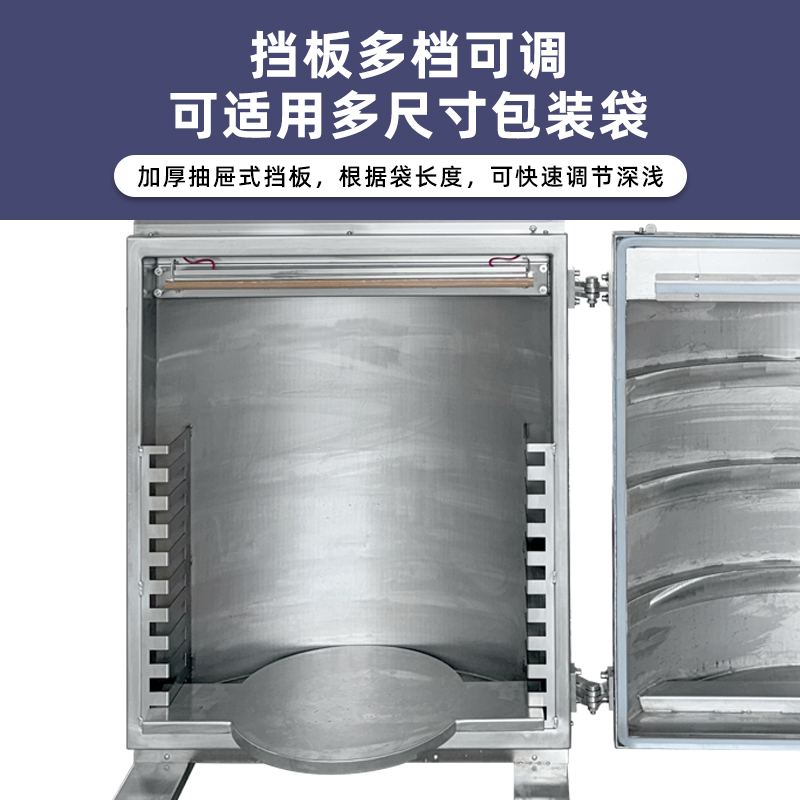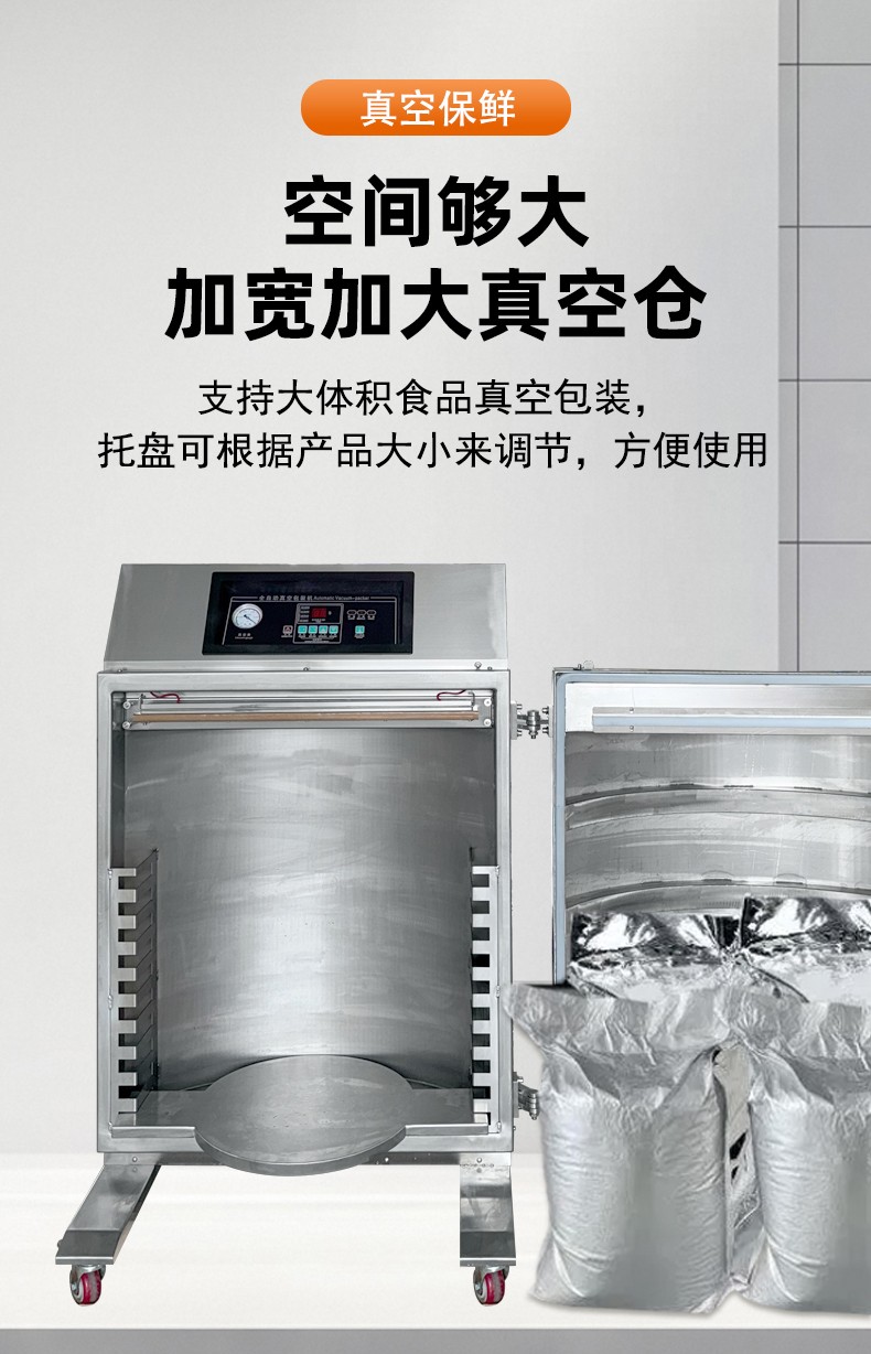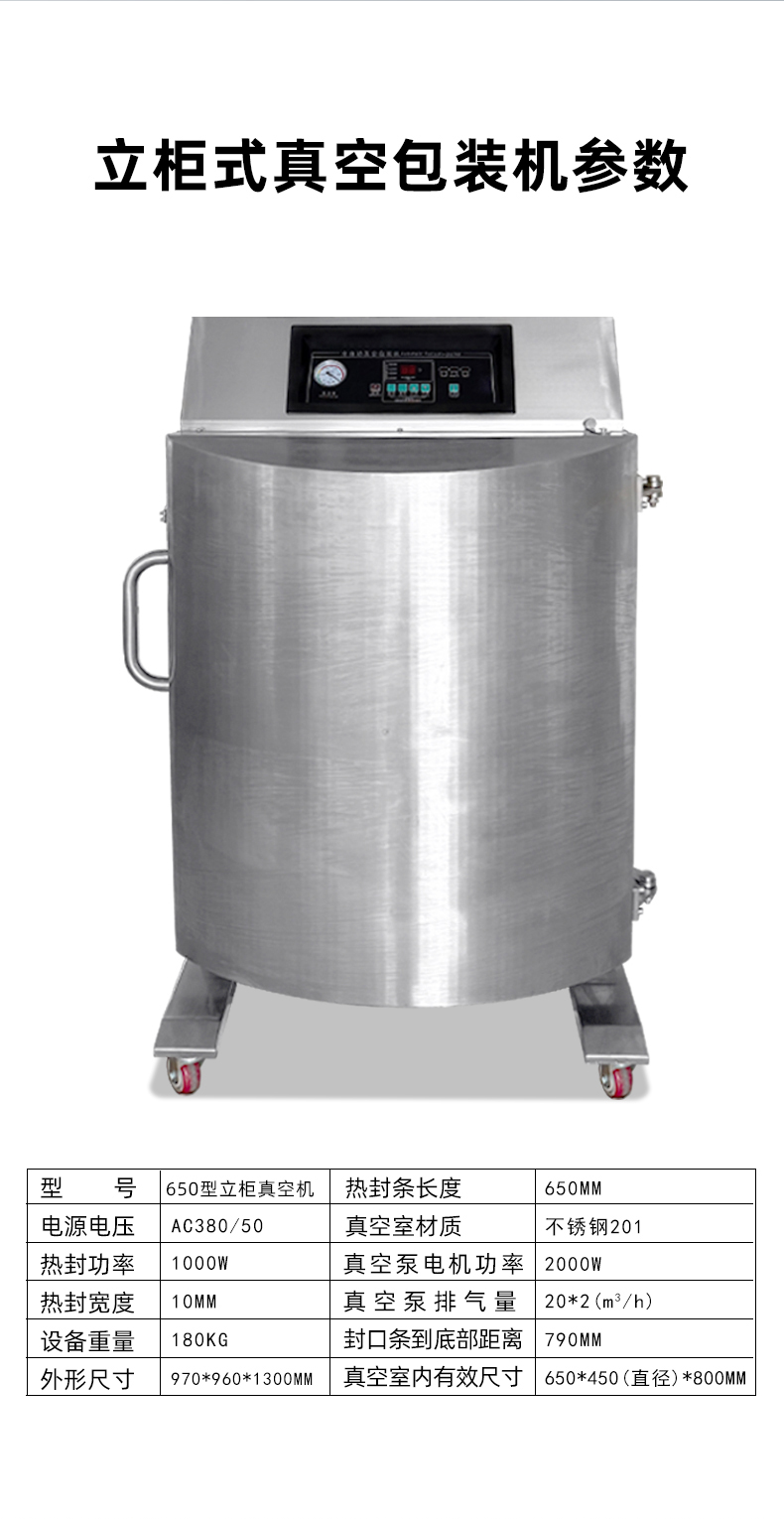 - 大容量真空室:立柜式真空包裝機(jī)的真空室容積較大,如 DZ-650L 型號(hào),其熱封有效尺寸可達(dá) 650×8mm,可同時(shí)處理大批量食材或大尺寸包裝,能滿足整只火腿、海鮮禮盒、大桶粉末顆粒等特殊形狀物品的封裝需求49。