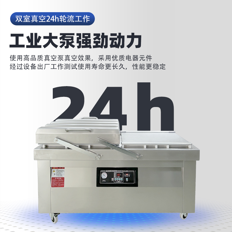 雙室真空包裝機通過 “雙真空室輪換作業(yè)” 實現(xiàn)抽真空與裝袋無縫銜接,核心是利用兩個獨立真空室的 “時間差并行操作”,讓設(shè)備在同一周期內(nèi)同時完成 “抽真空密封” 和 “人工 / 自動裝袋”,徹底消除單室機型 “抽真空時無法裝袋” 的等待間隙,大幅提升作業(yè)效率。其具體運作邏輯和優(yōu)勢可拆解為以下 3 點: