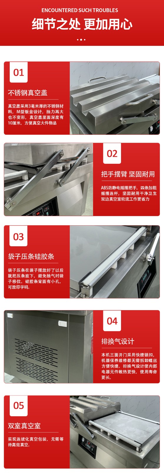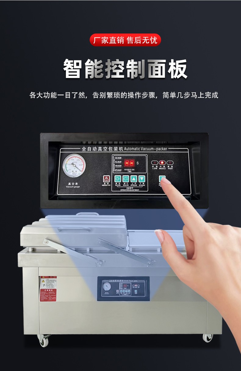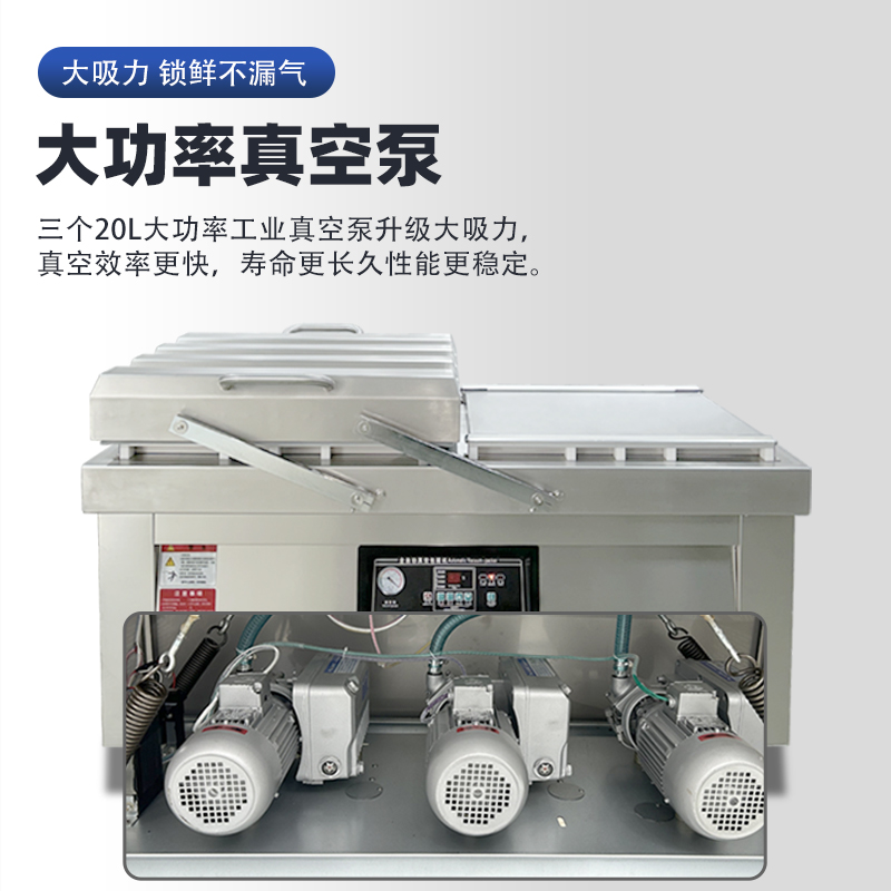 - 同一時間,右室真空蓋保持開啟,操作人員可同步將下一批待包裝產(chǎn)品放入右室包裝袋并擺好(即 “裝袋準備”),無需等待左室流程結(jié)束 —— 此時左室 “忙” 于抽真空密封,右室 “閑” 于裝袋,兩者并行不沖突。