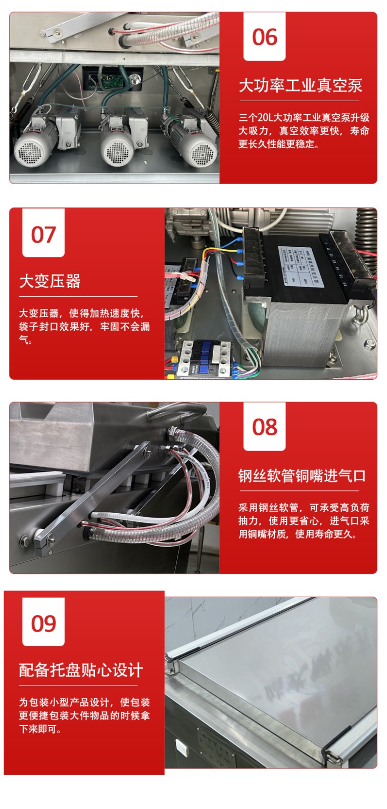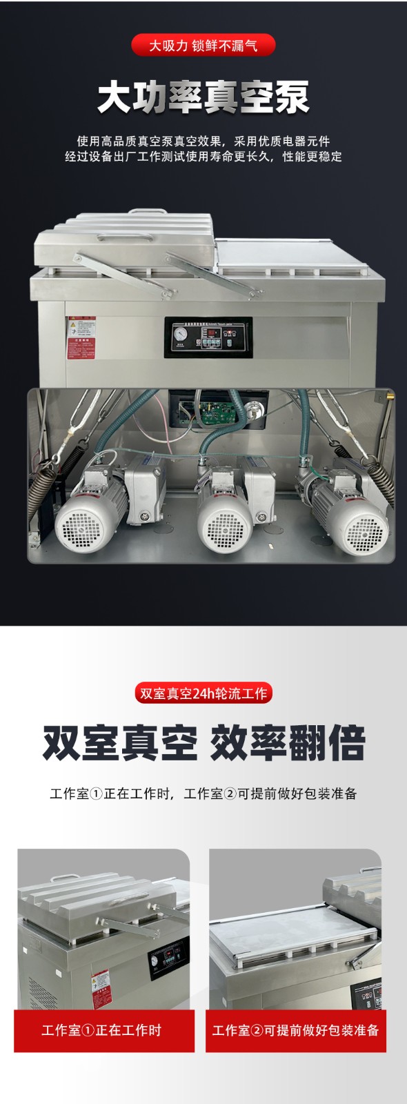 單室機型的致命短板是 “流程串行”—— 必須等 1 個周期(抽真空→熱封→回氣)完全結(jié)束、取出成品后,才能重新裝袋、啟動下一個周期,中間存在 10-20 秒的 “裝袋等待間隙”。