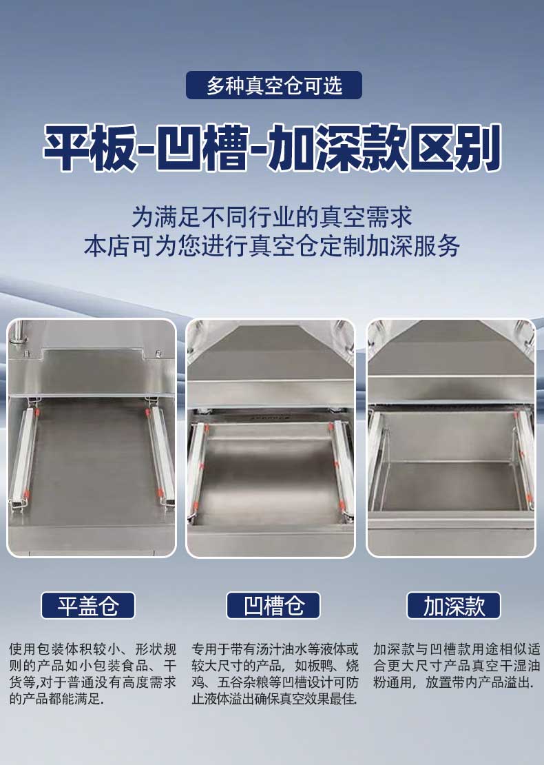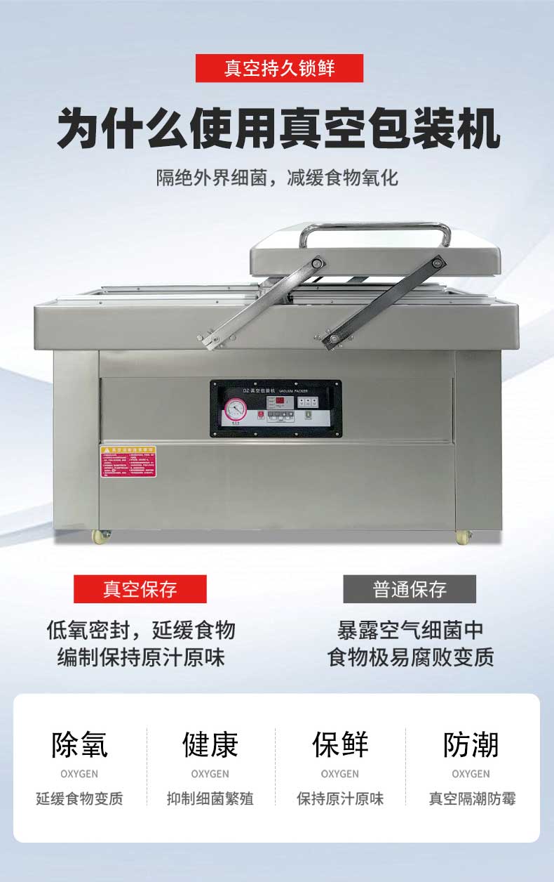 雙室凹槽真空包裝機(jī),專為鹵味、水產(chǎn)、預(yù)制菜等帶湯汁、高水分產(chǎn)品量身打造,創(chuàng)新下凹式真空室結(jié)構(gòu)搭配雙室交替工作模式,既解決液體包裝溢漏難題,又大幅提升生產(chǎn)效率,是食品加工、生鮮鎖鮮的得力設(shè)備。